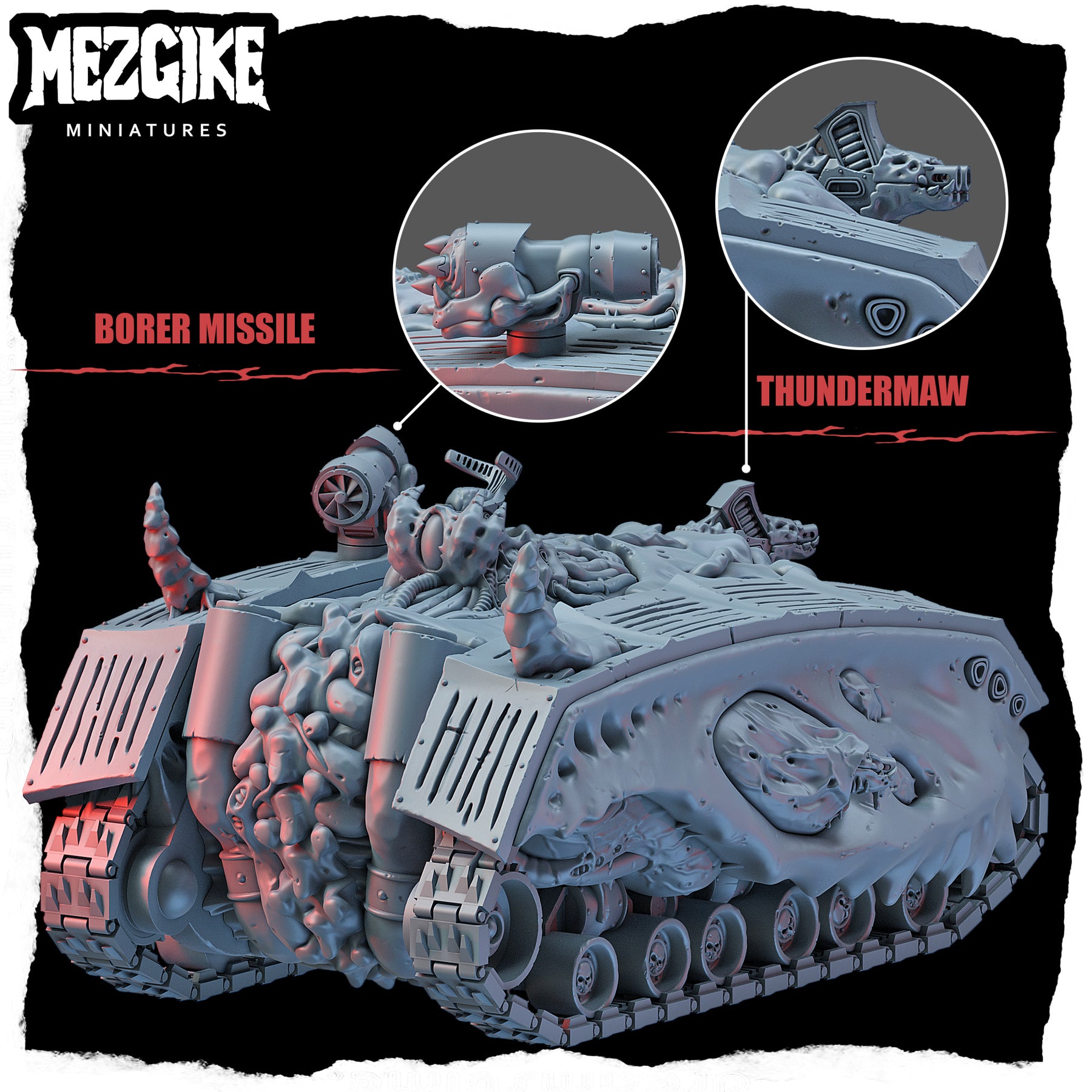 The Sarcocarne Bearer is armed with an optional Borer Missile Launcher and Thundermaw. The kit has been designed as a fully modular system, compatible with other Fleshbound Sarcocarne tanks. The hull is constructed from three primary components — front, middle, and rear sections — all of which are interchangeable with future Sarcocarne tank releases.